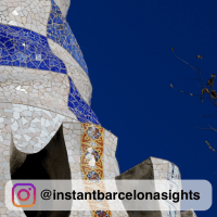 Could the evil-looking mushroom on the roof of the right-hand house suggest a wicked witch might live here? Might the blue and white theme on the left-hand house be a nod to the flag of Bavaria and Ludwig II, the money behind Richard Wagner, the German composer that hinted in his opera Parsifal that the Holy Grail was hidden in Catalonia? Gaudi knew Humperdinck and Englebert worked with Wagner on Parsifal. Are we supposed to pass between good and evil as we enter the park?