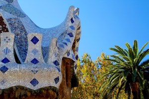 If you have watched a news report about the Catalan independence debate, you should have no problem with recognising the Senyera in the shape of a shield as you climb the steps. Next you encounter the ‘dragon’. Of course, a nod to Sant Jordi, you might think, but doesn’t it look more like a lizard than a dragon? Eusebi Guell spent time living in Nimes, the one time northern most city of Old Catalonia and twinned with Barcelona. Guess what is on the crest of Nimes? A crocodile and a palm tree. Food for thought.